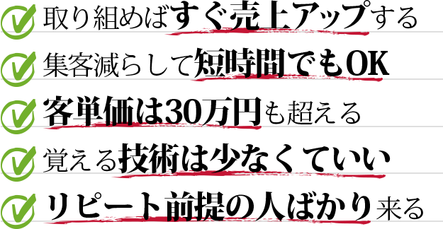 繁盛するための原則や「これがなければ成功できない」とも言える3つの力も公開してしまいます。多種多様な専門知識と手技テクニックを複合し、今回のノウハウが生まれています。その全てを時間が許す限り解説していきます。
