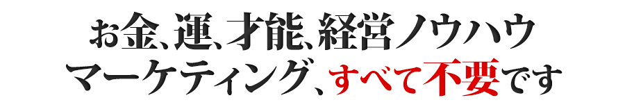 ですが安心してください。この方法を実践するにあたって、過剰な広告費や場所柄などの運的要素、経営ノウハウやマーケティングの知識は不要です。