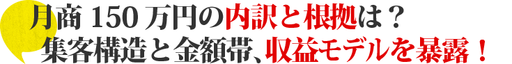 今回、1ヶ月たった5名の集客でさえも、月商150万円を得る方法を公開していますが、普通の成功者なら隠すだろう収益モデルも公開します。それを知ることにより、あなたは私を超えて更に上の売上を手にすることも可能になります。