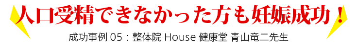 35歳でクリニックでタイミング療法半年後、体外受精で15個採卵できるも杯盤胞まで分割しない方が来院。施術3ヶ月治療後、再び体外受精のため採卵すると16個中5個が杯盤胞まで分割し妊娠し、つわりもなく現在安定期に入った。