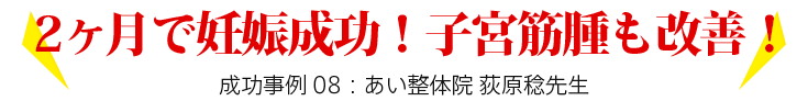 2年間不妊治療に通っていた方が、来院して2ヶ月で妊娠しました。 子宮筋腫のお腹の張りで悩んでいた方も、2回目来院した時には、張りを感じることがなくなったと喜んでくれました。