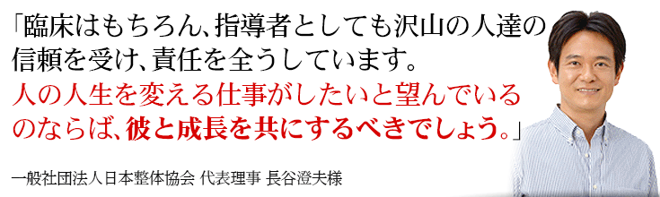 治療家の成功とは、患者の幸せの先にこそ有るものです。その場しのぎの施術や、我流で結果がでない施術なら、成功しないのは当然です。むしろ、受けるべきサポートを受ける妨げになってしまいます。このメッセージをここまで読んで頂いたあなたなら、きっと患者さんを幸せにできます。