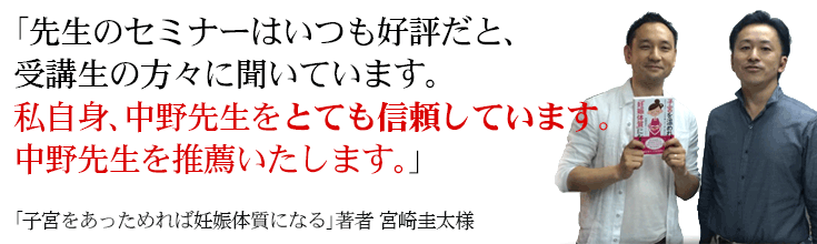 中野智彰先生との出会いは、セミナーでご一緒させて頂いてからの付き合いになります。当初から、「この人、他の人と何か違うなぁ」という印象がありました。何が違うのかと言いますと、世の中で不妊というレッテルを貼られそれに苦しめられている方達を本当にどうにかしてあげたいと言うその想い。